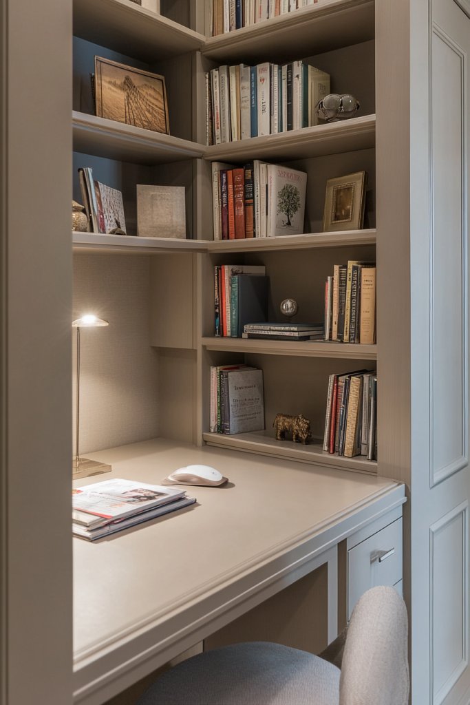 Imagine a cozy corner with a sleek wooden desk tucked into a recess, flanked by custom built-in shelves reaching up to the ceiling. Soft LED task lighting casts a warm glow over your workspace, while a plush area rug adds comfort underfoot. The shelves display neat stacks of books, decorative boxes, and essential supplies—all within arm’s reach. This setup feels both organized and inspiring, inviting you to settle in and get to work.