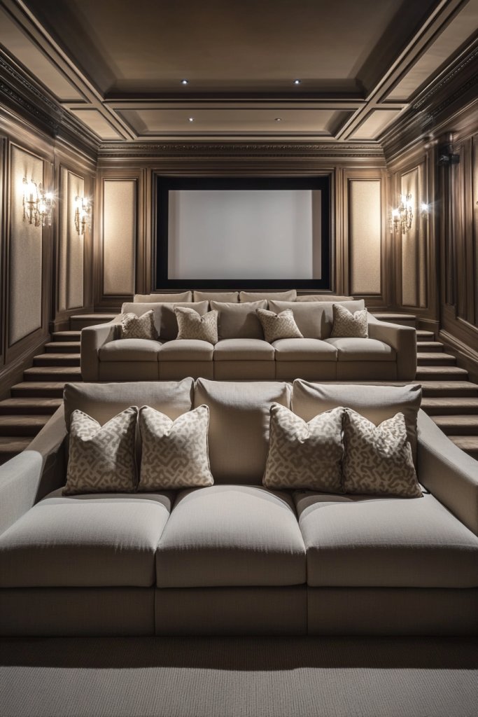 10. Elegant Home Theater with Tiered Seating and Acoustic Panels
