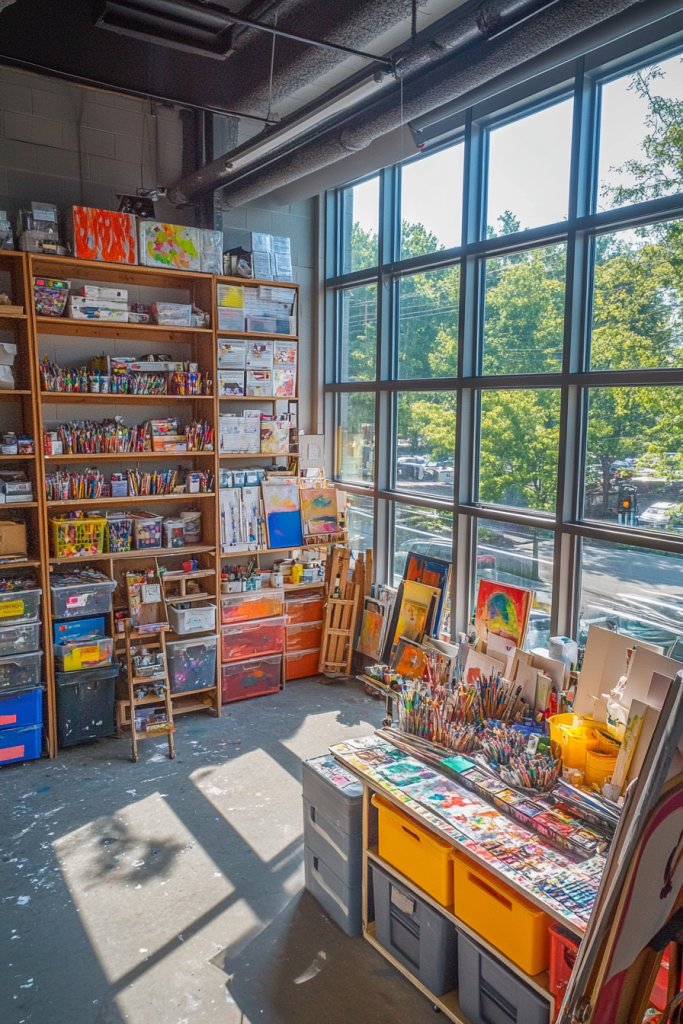 Picture a bright room with large windows that flood the space with natural sunlight. Adjustable track lighting supplements daylight on cloudy days. A large worktable with a smooth surface hosts your latest project, while open shelves and labeled bins store paints, brushes, and canvases. The walls are painted in a neutral tone to reflect light, with pegboards for hanging tools and supplies. It’s a cheerful, functional environment that invites you to create freely.
