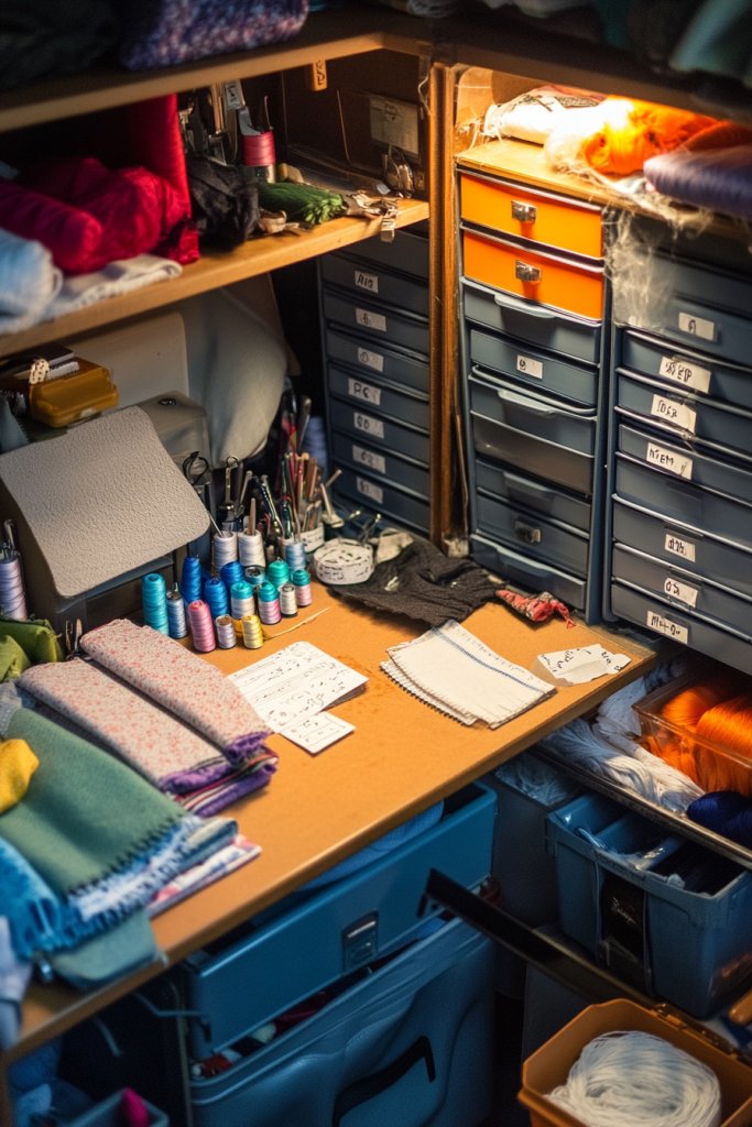 Imagine a bright corner with a sturdy worktable covered in fabric remnants and tools. Open shelving holds neatly labeled boxes of threads, needles, and notions, while a pegboard keeps scissors and rulers within reach. A comfortable ergonomic chair and task lighting make long sewing sessions easy. The space feels organized, inspiring, and tailored for creativity, with everything you need at your fingertips.