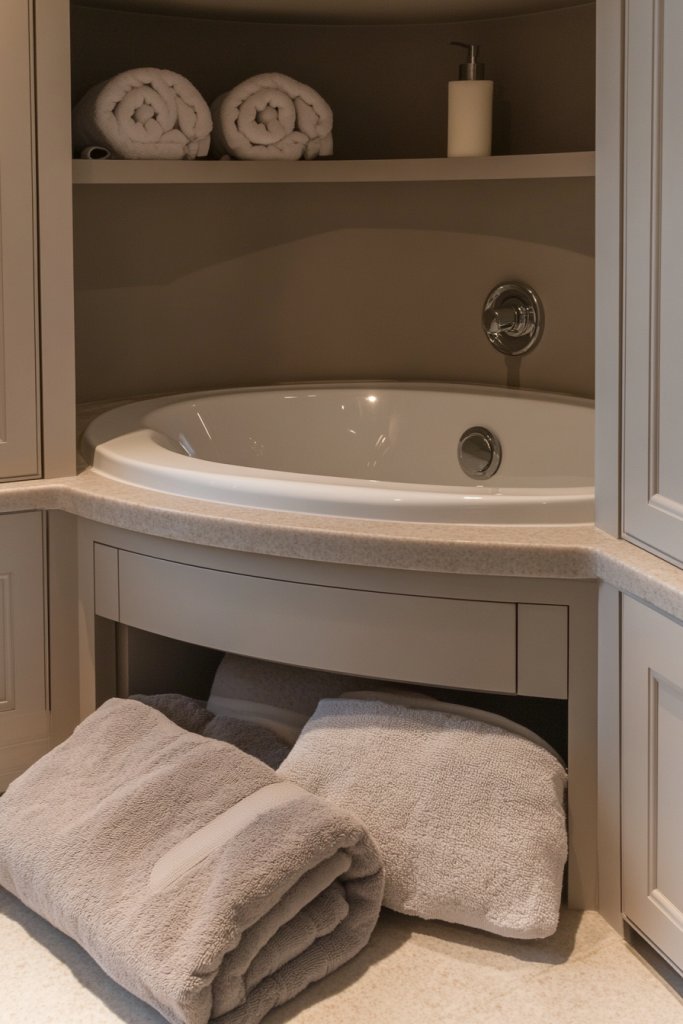 16. Elegant Home Spa Corner with Compact Tubs and Storage