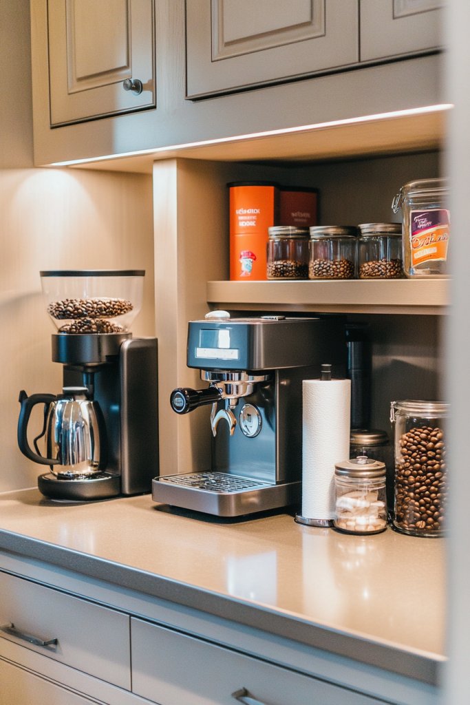 Picture a sleek countertop with a compact espresso machine, a grinder, and a small refrigerator for milk and cream. Open shelves hold stylish mugs, coffee beans, and accessories, while a pegboard keeps tools organized. Warm lighting highlights the setup, and decorative containers add a personal touch. It’s a cozy, organized space designed to make your daily caffeine ritual effortless and enjoyable.