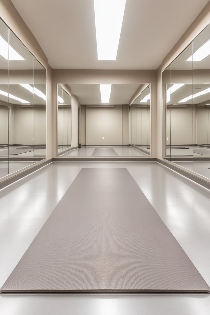 Picture a calm, uncluttered room with soft, non-slip mats covering the floor. Large mirrors on one wall help perfect your posture and make the space seem bigger. Gentle ambient lighting creates a soothing atmosphere, while a small shelf holds your yoga blocks or fitness accessories. The room feels open, peaceful, and ready for your daily practice—whether yoga, stretching, or strength training. It’s your personal wellness retreat.