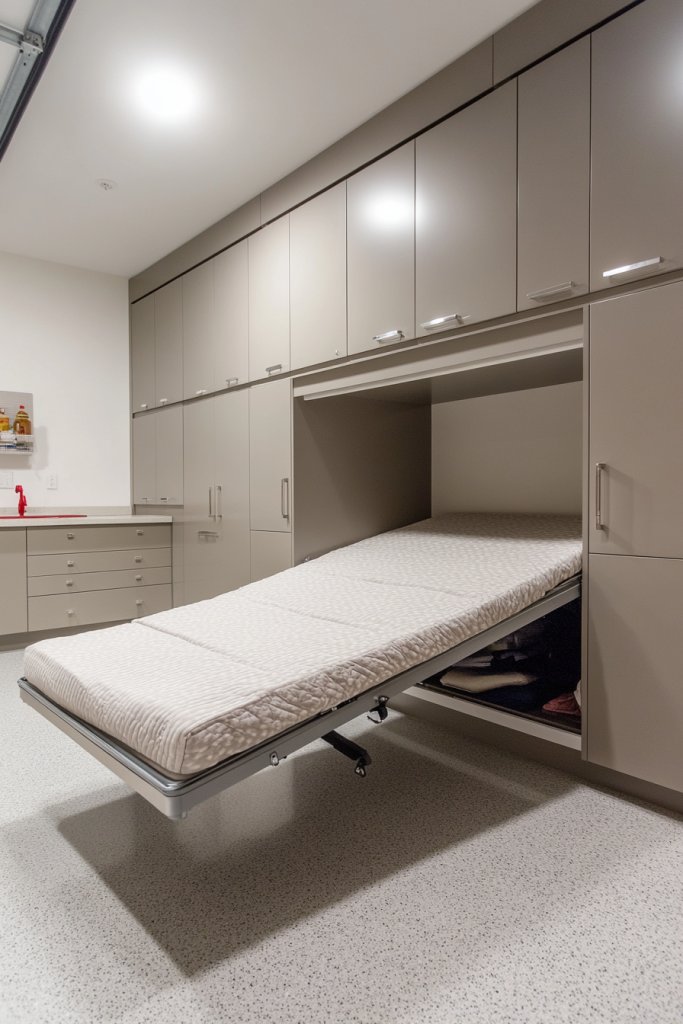Picture a compact room with a sleek Murphy bed that folds neatly into the wall during the day, revealing a wall of custom cabinets and a cozy reading nook. Soft lighting highlights the space’s dual purpose, with plush bedding tucked away behind a smooth panel. When guests arrive, you simply lower the bed, revealing a comfortable sleeping area with crisp linens and a decorative throw pillow. It feels like a boutique hotel suite—functional, stylish, and inviting.