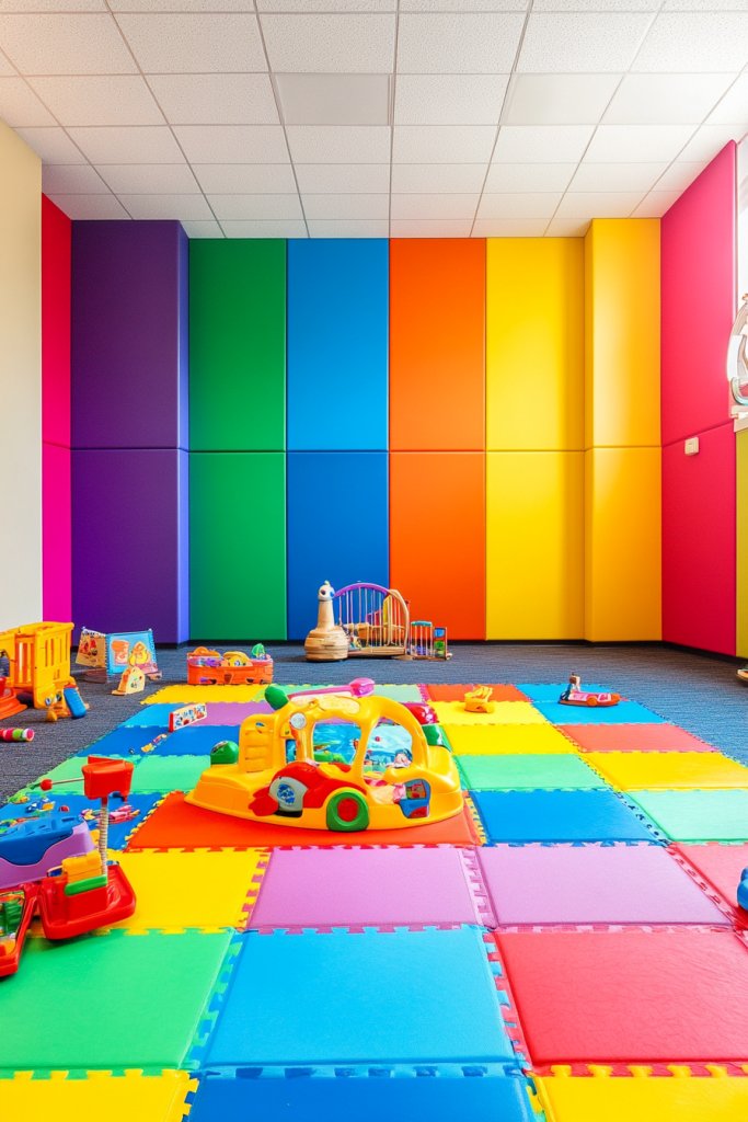 Imagine walls painted in cheerful shades, accented with colorful wall panels that double as art and storage. Durable, washable surfaces are perfect for messy hands and creative projects. A soft foam mat covers the floor, inviting kids to sit and play comfortably. Shelves filled with bins and baskets keep toys organized, while playful decals and murals add personality to the room. The whole space feels energetic, inviting, and ready for fun.