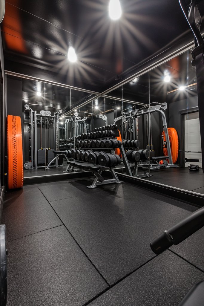 4. Stylish Home Gym with Rubber Flooring and Mirrors