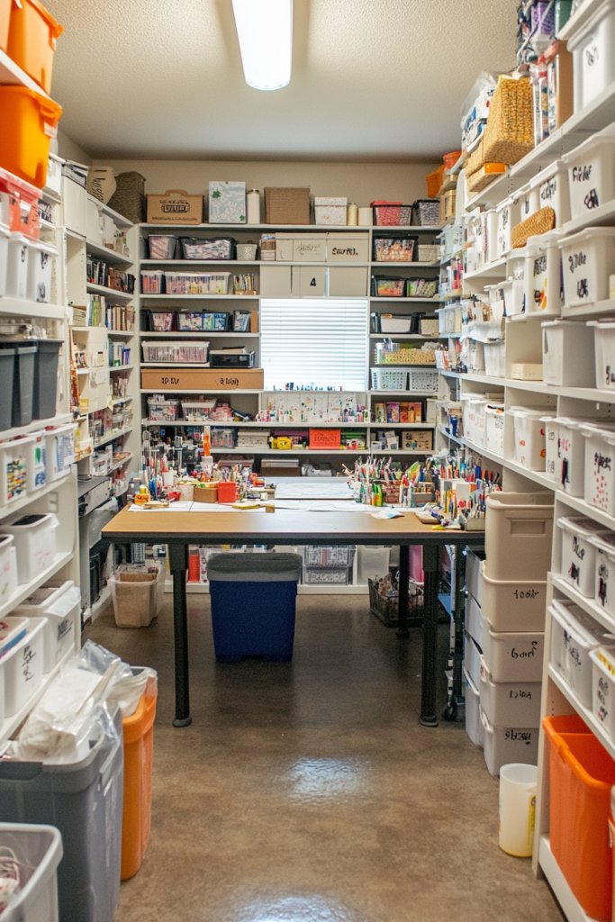 Visualize a bright, airy room with open shelving filled with neatly labeled boxes and bins. A large worktable with a durable surface stands ready for your latest project, surrounded by pegboards holding tools and supplies. Storage cabinets hide away paints, fabrics, and other materials, while natural light streams through large windows. The space feels inspiring and clutter-free, inviting you to start your next masterpiece.