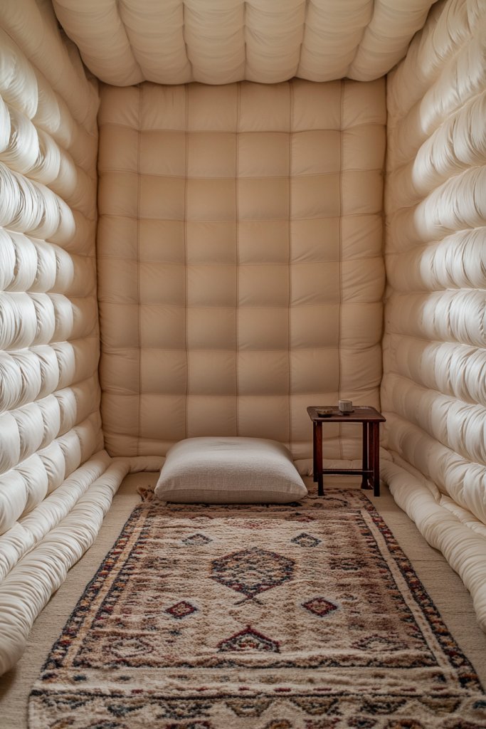 7. Minimalist Meditation Space with Soundproofing and Soft Textures