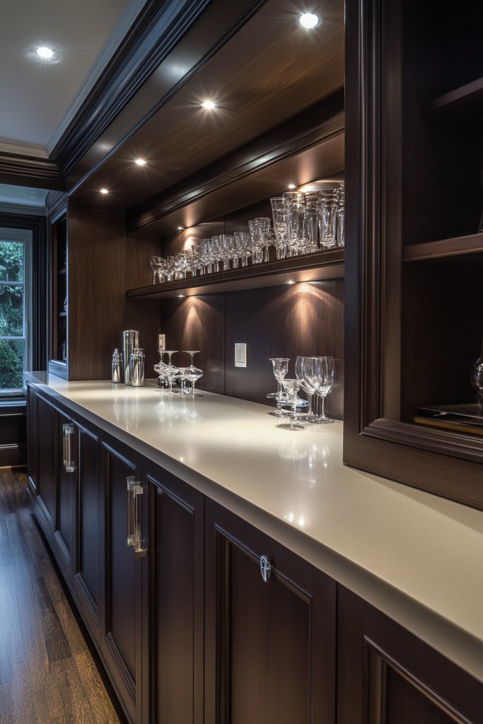 Envision sleek, floor-to-ceiling cabinetry with a polished countertop that doubles as a serving bar. LED strip lighting underneath the cabinets adds a modern glow. Shelves above hold your favorite glassware and drink accessories, while a small wine fridge or mini-fridge keeps beverages chilled. The space feels sophisticated yet inviting, perfect for casual gatherings or special occasions. The ambient lighting and glossy surfaces create a luxe vibe.