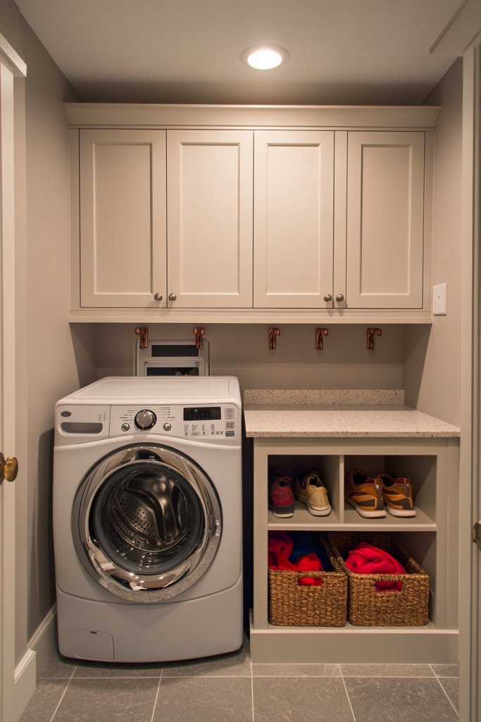Imagine a space with tall, custom cabinets for shoes and coats, alongside a countertop for folding laundry. Hooks and cubbies keep jackets and backpacks organized, while a deep sink handles messy tasks. Durable flooring withstands spills, and a wall-mounted drying rack or retractable clothesline maximizes utility. The whole setup is efficient, clutter-free, and designed for busy mornings or weekend laundry marathons.