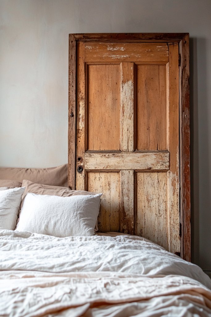 Picture a weathered wooden door with peeling paint, leaning against the wall behind your bed. The distressed texture adds a layer of history, while maybe a splash of bold color or stencil art elevates its character. Imagine the soft glow of string lights or candles reflecting off the aged surface, creating a cozy, inviting atmosphere. It’s like bringing a piece of history into your modern sanctuary.