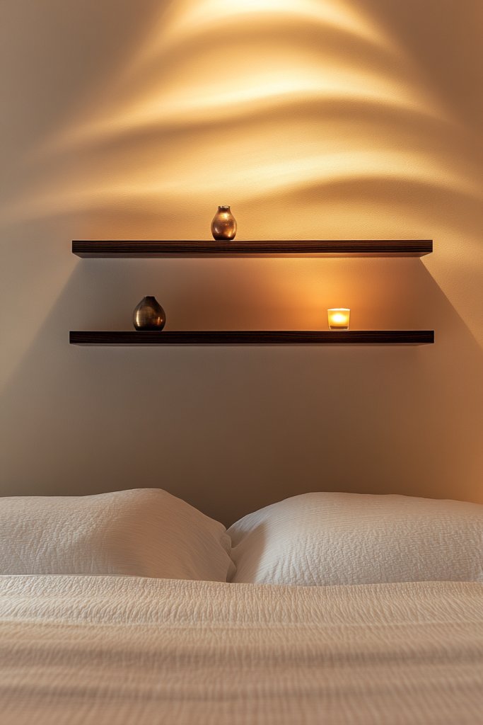 Imagine sleek floating shelves positioned behind your bed, holding candles, books, or decorative objects. The layered arrangement adds depth and interest to the wall, transforming it into a curated display. Use different lengths and heights to create a dynamic, personalized look. The combination of open storage and decor elevates the space visually.