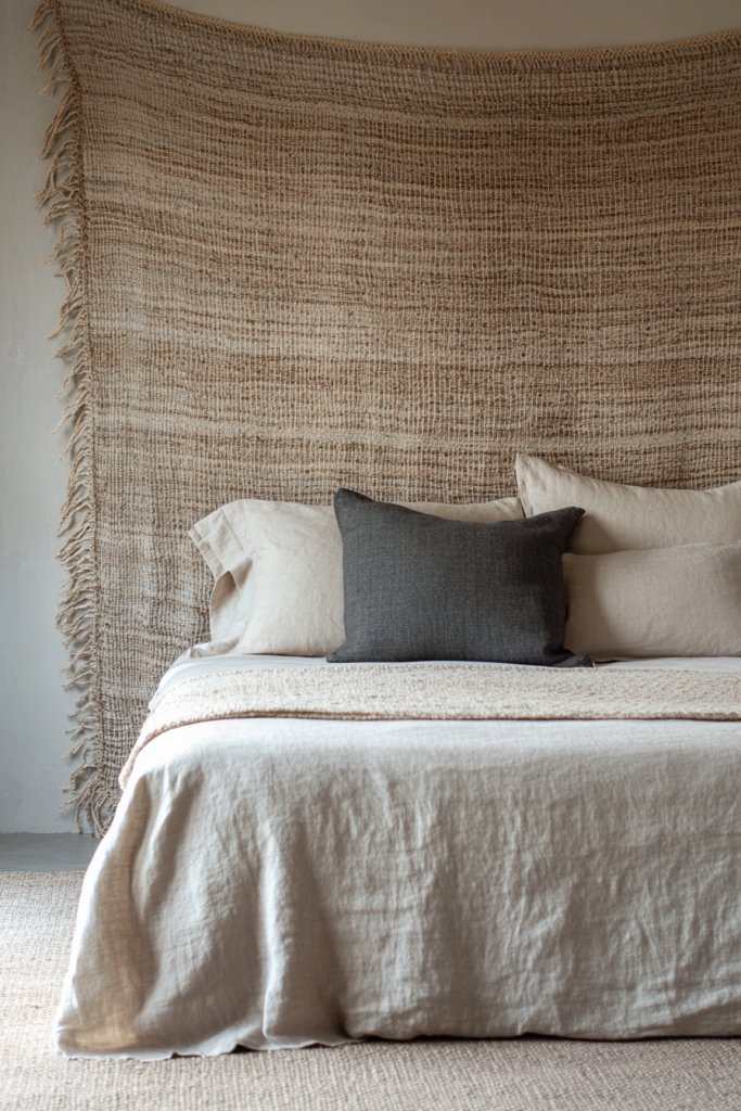 Picture a spacious, textured textile with intricate weaving patterns and earthy tones, draped behind your bed. The tactile fibers add depth and softness, transforming a plain wall into a focal point. The natural materials absorb ambient light, creating a cozy glow. It’s like bringing a piece of nature into your personal sanctuary.