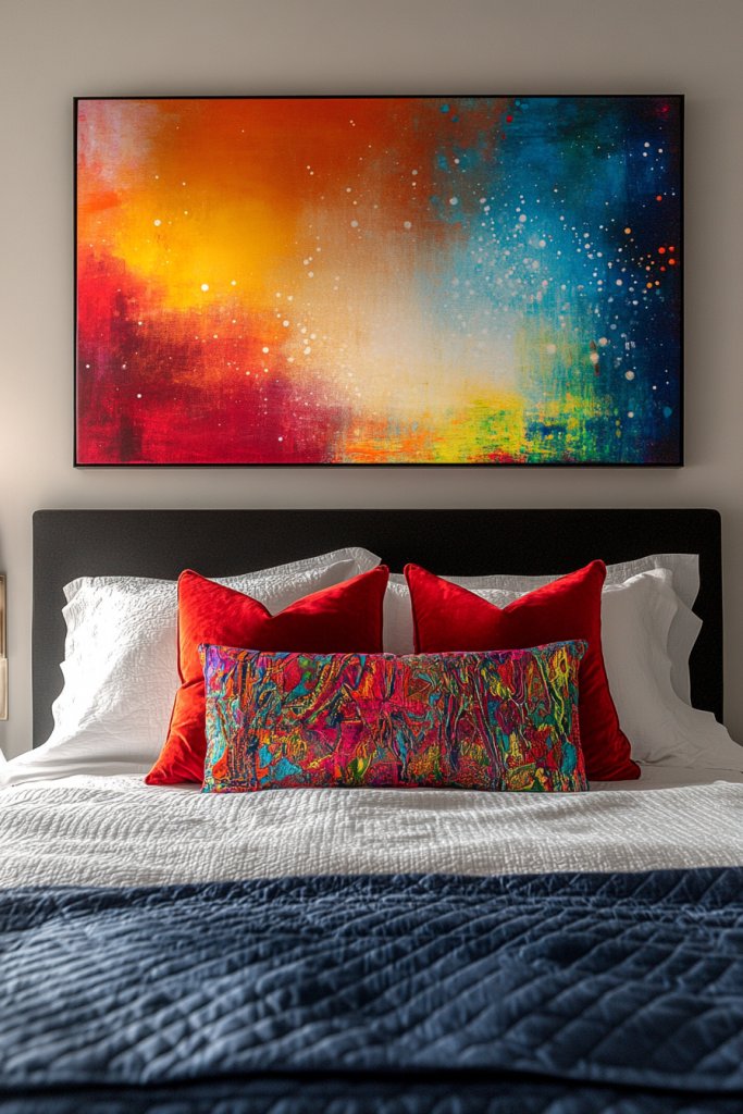 Craving a striking focal point that’s easy to update? An oversized canvas or art panel behind your bed creates a bold, artistic statement. It’s a stylish, affordable way to infuse personality and color into your space.