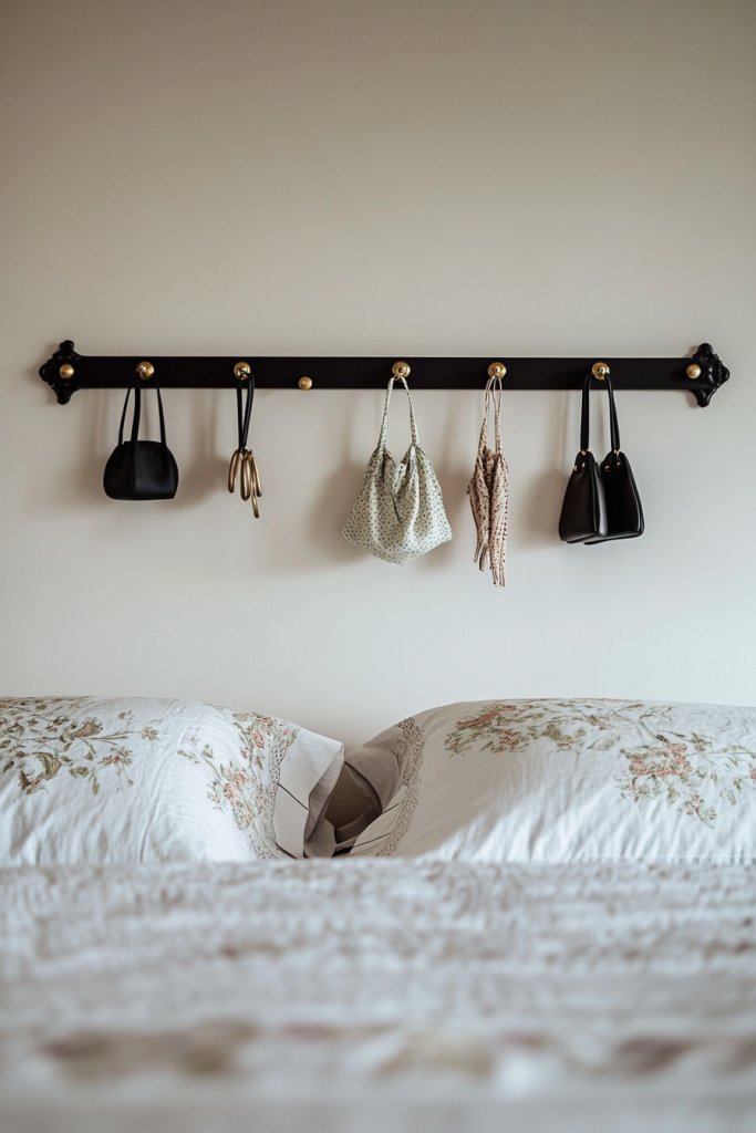 15. Attach a Row of Decorative Hooks or Pegs for a Practical Headboard