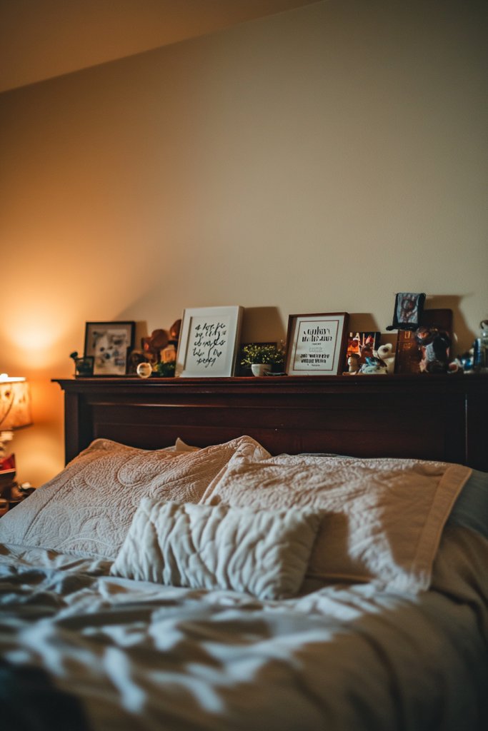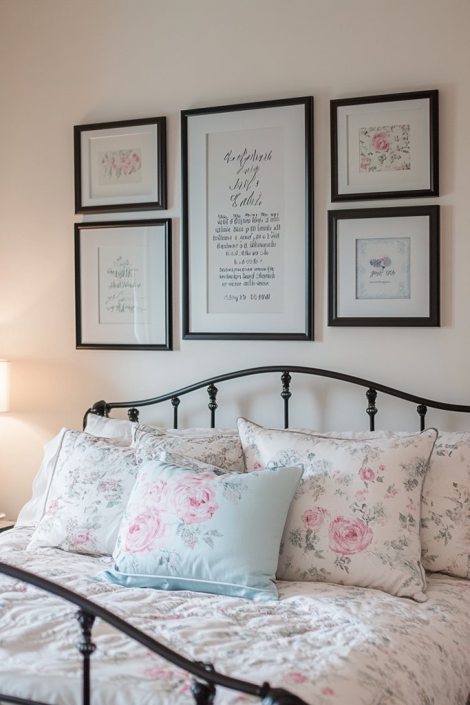 Feeling like your bedroom lacks personality? A gallery wall of framed prints and photos can instantly personalize your space. It’s a creative way to showcase your favorite memories, artwork, or quotes without breaking the bank. Plus, it turns a blank wall into a focal point full of meaning.