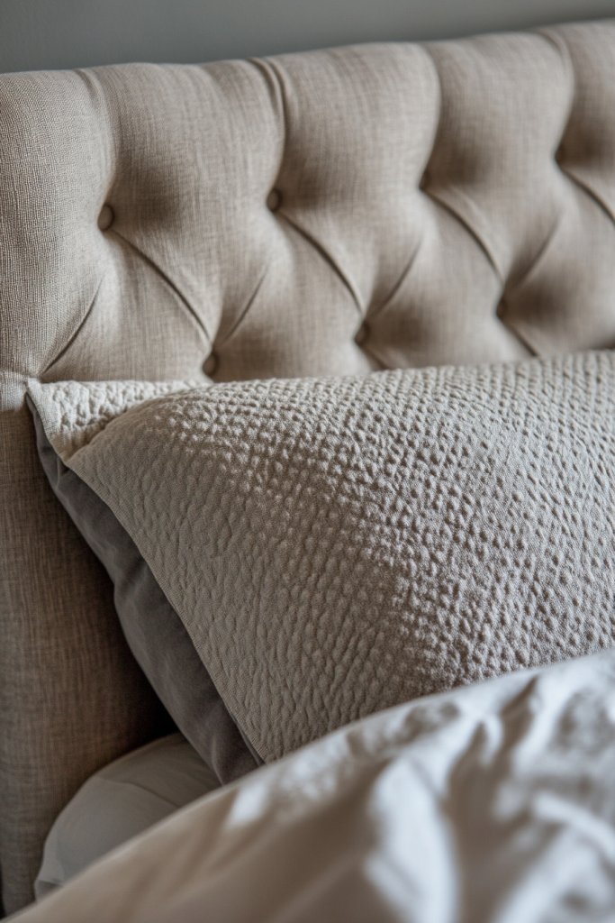Picture a lightweight fabric panel, loosely draped or fitted over a sturdy wooden frame, resting behind your bed. The fabric’s relaxed folds and textures create a cozy, inviting feel. You might choose linen, cotton, or a light quilted material in calming colors or patterns. The overall look is effortless yet stylish, perfect for a casual bedroom aesthetic.
