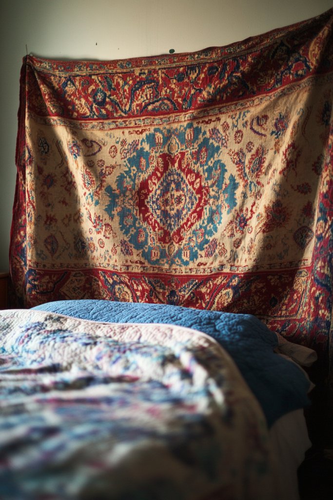 Picture a vibrant, patterned textile draped behind your bed, cascading down to the floor. The fabric’s rich colors and textures create an instant focal point, transforming a plain wall into an artful display. Soft, woven fibers add warmth and coziness, while bold prints inject personality. Imagine the gentle sound of fabric moving softly with air, adding a calming ambiance.