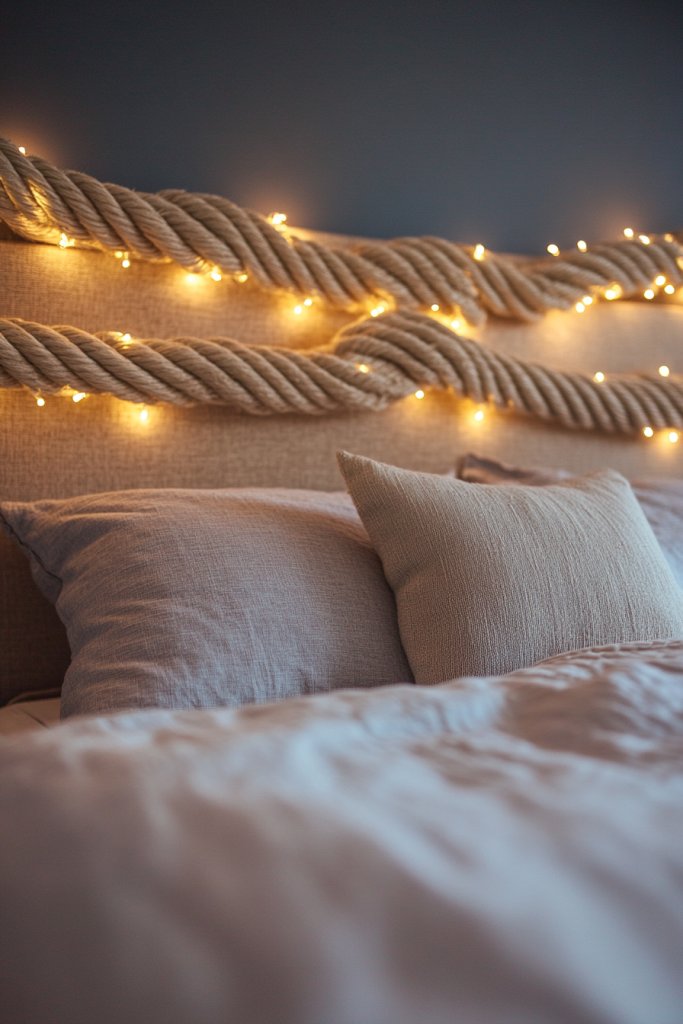 Want to add a warm, inviting glow to your bedroom without installing complex lighting? Wrapping a corded or twisted rope with fairy lights creates a soft, ambient headboard that’s both functional and charming. It’s an inexpensive way to add texture and mood lighting.