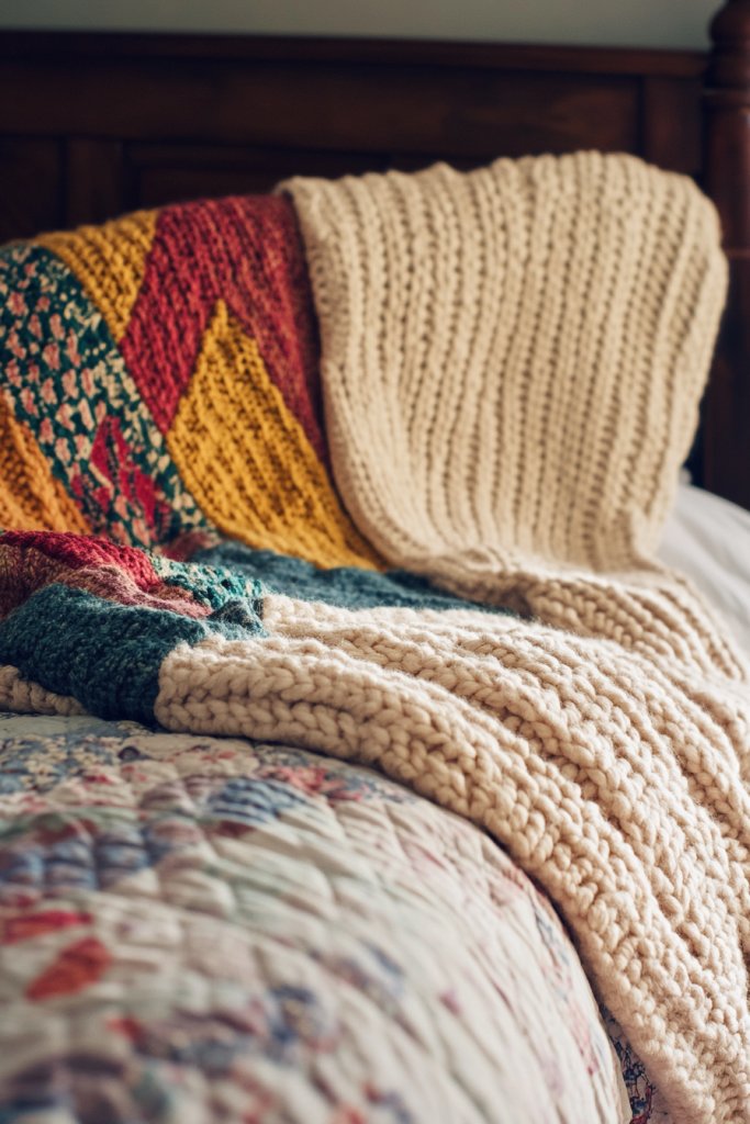 Imagine a large, knitted sweater draped over a board or directly on the wall behind your bed. The chunky stitches and vibrant colors create a tactile surface that invites touch. Alternatively, a patchwork quilt with rich patterns and textures hangs like a tapestry, adding depth and warmth. The combination of textiles creates a layered, cozy aesthetic that’s perfect for fall or winter.