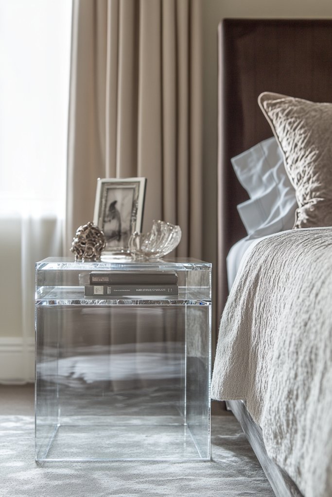 Select furniture or decor items made from lucite or frosted glass—these can be custom-ordered or found in boutique shops. Use transparent or semi-transparent shelving units to display curated items. Combine with metallic or upholstered pieces to balance the look.