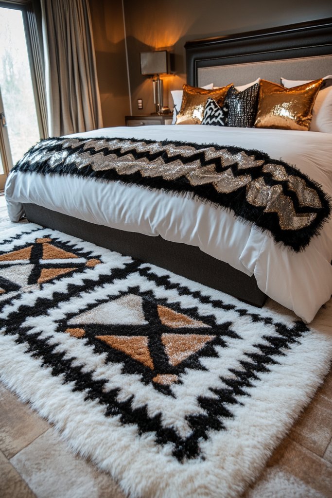 Imagine a large rug with repeating chevron or step motifs in black, white, or metallic shades, placed under the bed. The pattern guides the eye and creates a balanced foundation. The rug’s texture adds warmth and comfort, contrasting with sleek furniture.