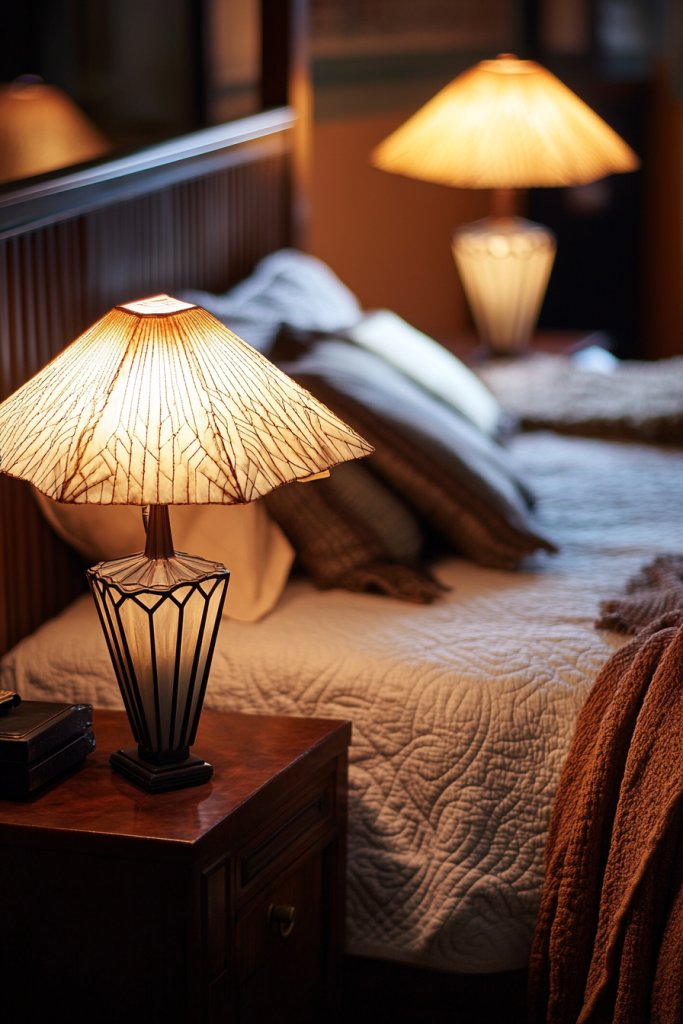 Select lighting fixtures with geometric or stepped motifs that match your decor. Position lamps symmetrically on either side of the bed for balance. Install dimmer switches for adjustable lighting. Use warm bulbs to enhance the cozy, vintage feel.