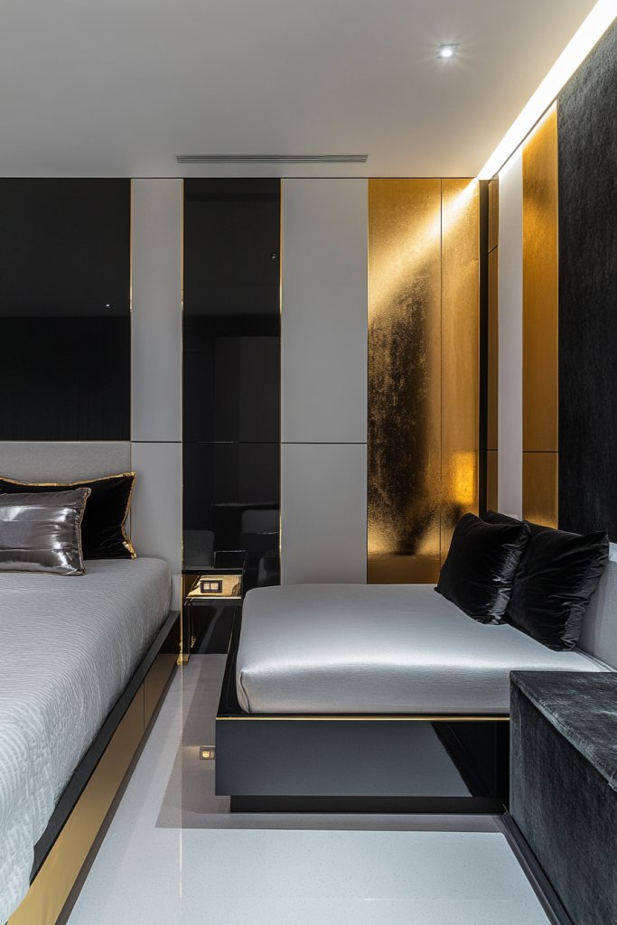 Imagine a wall adorned with gold-trimmed wallpaper featuring sharp geometric shapes, catching the light just right. Gold hardware on sleek dressers or nightstands adds subtle sparkle, while decorative trim on textiles creates a layered, opulent effect. The contrast between matte surfaces and shiny accents creates visual intrigue that draws the eye.