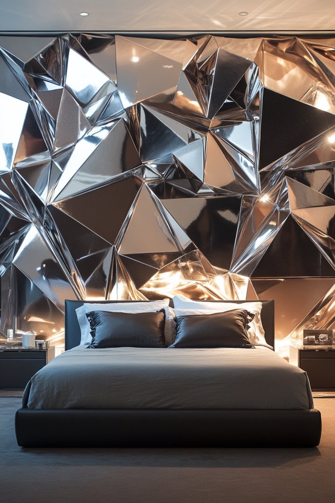 Imagine a ceiling coated in shimmering metallic paint or foil, catching the ambient light with every movement. Subtle recessed lighting or hidden LEDs highlight the reflective surface, creating a luminous, almost celestial effect. The room feels taller and more expansive, with the ceiling acting as an artful crown.