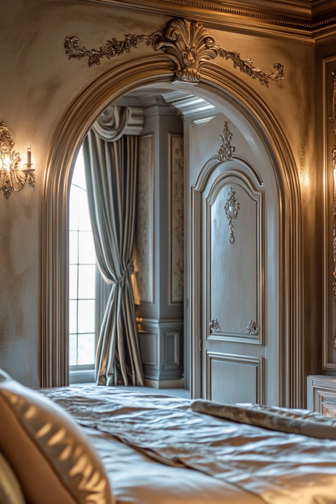 Imagine a sleek arched doorway with intricate moldings framing the entrance, leading into a cozy bedroom. Decorative wall frames with stepped or fan motifs surround mirrors or artwork, emphasizing geometric precision. These elements add depth and a regal feel.