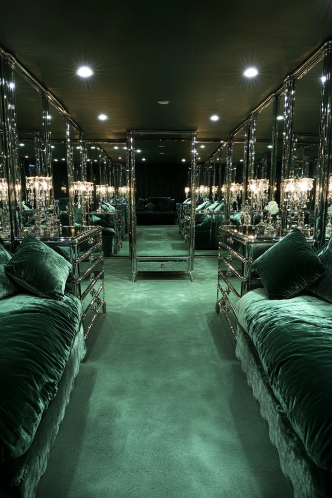Select furniture with mirrored panels or surfaces—these can be custom-ordered or found at vintage shops. For upholstery, pick velvet in deep, saturated hues like emerald, sapphire, or ruby to add a regal touch. Use a professional for installation if needed, especially for large mirrored pieces to ensure safety. Pair with soft lighting to enhance the reflective quality.