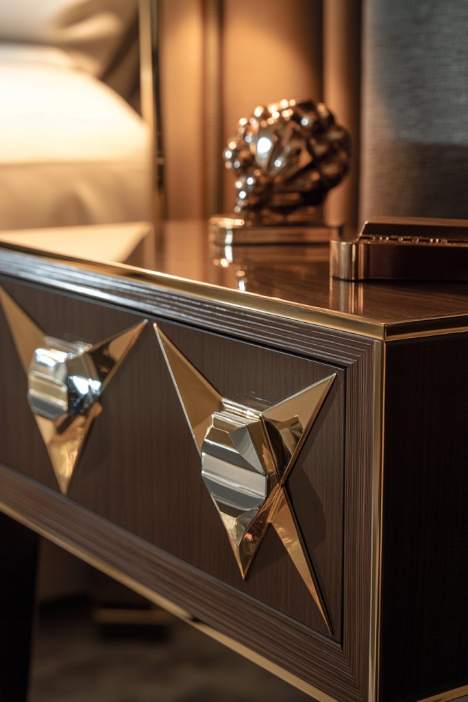 Small details can make or break a design, especially in a luxe art deco bedroom. Upgrading your furniture hardware to geometric or stepped brass and chrome pulls instantly elevates the look. It’s a subtle touch that leaves a lasting impression.