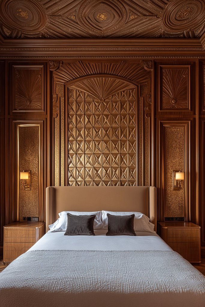 Want to add architectural interest to your bedroom without a major renovation? Art Deco-inspired wall paneling and moldings introduce texture and depth that elevate the entire space. It’s like giving your walls a stylish, sculptural makeover.