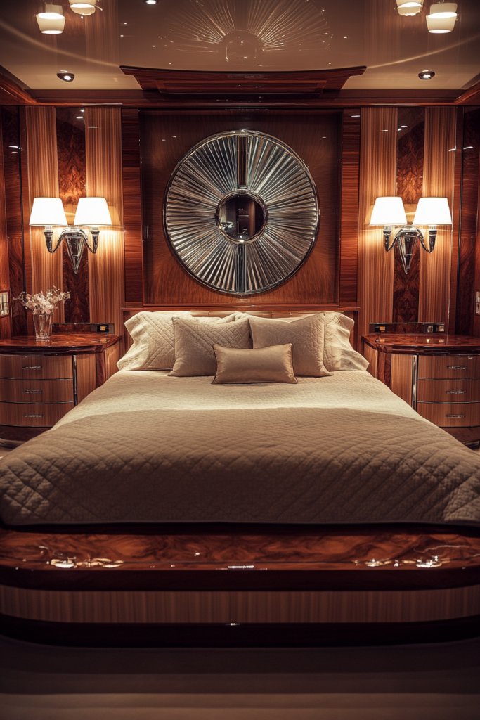 Visualize a bed placed exactly in the center of the room, flanked by matching nightstands or sconces. Art deco-inspired mirrors or decorative panels are hung precisely above the headboard, creating a perfect visual anchor. The symmetry guides the eye naturally and fosters a sense of order.