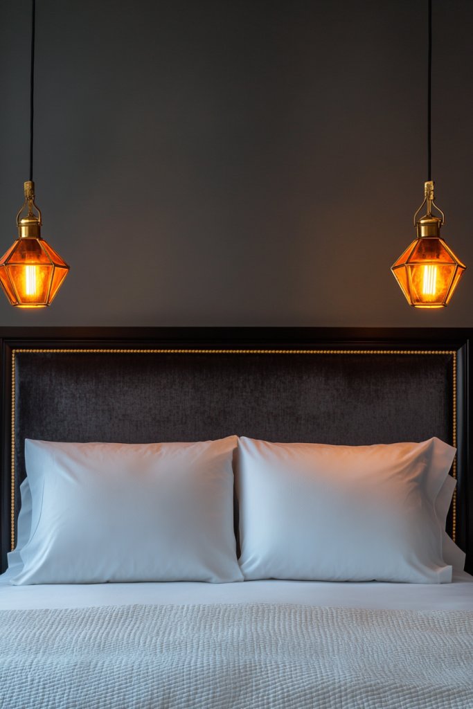 Imagine brass pendant lights with angular, sunburst-shaped shades hanging above your bedside tables. The geometric design casts interesting shadows and creates a focal point that draws the eye upward. Soft, warm light spills through the shades, bathing the room in a cozy glow.