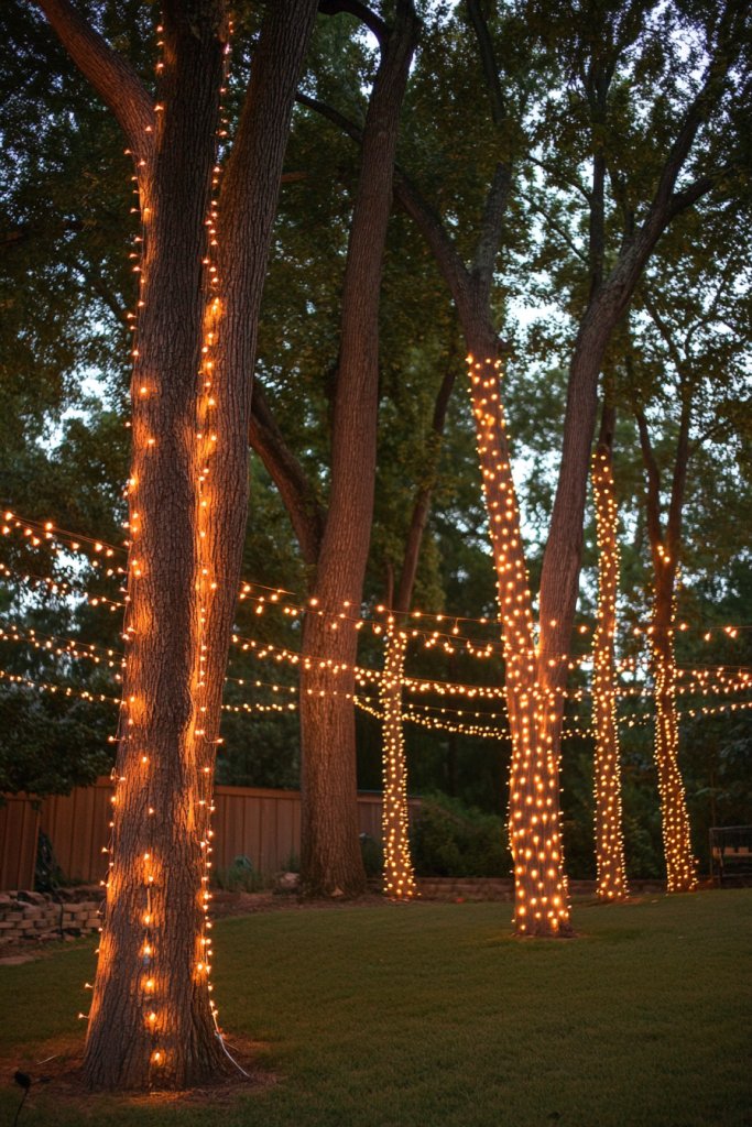 Imagine soft, golden lights draped loosely between sturdy tree trunks, casting a gentle shimmer across the foliage. The lights sway slightly with every breeze, creating a starry canopy overhead. Beneath, a rustic wooden table and chairs sit ready for evening gatherings, illuminated by the warm glow. The textured bark contrasts beautifully with the smooth, glowing string, making the space feel intimate and inviting. It’s like stepping into a cozy fairy land every night.