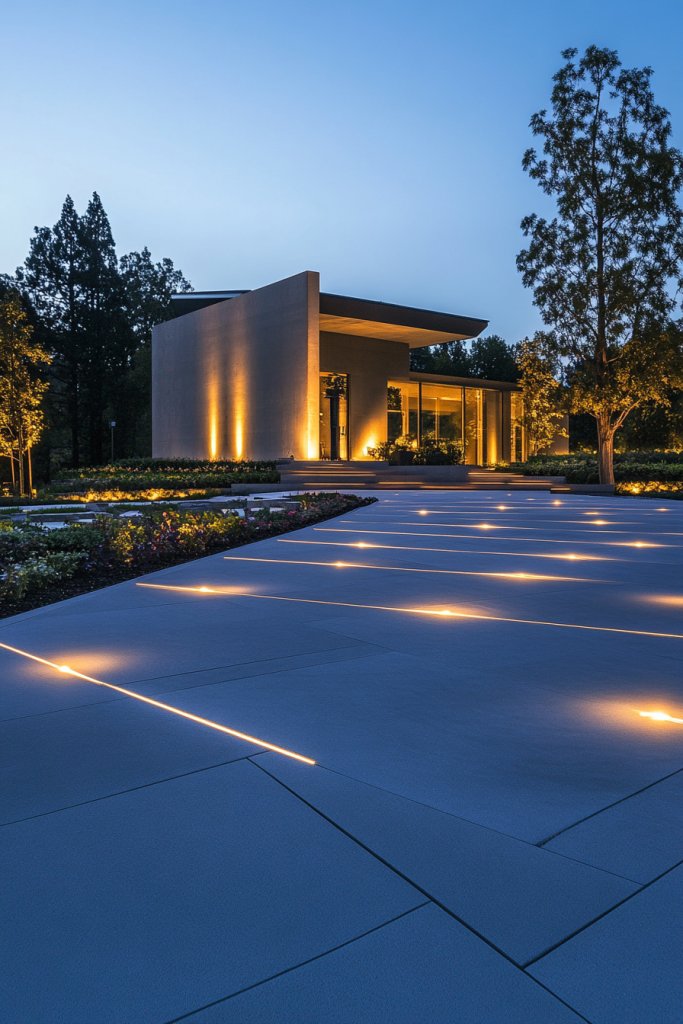Visualize low-profile lights embedded flush with your stone or concrete surfaces, casting a subtle glow across walkways or around seating areas. The subtle illumination emphasizes textures and edges, creating a sophisticated ambiance. During the night, the lights blend seamlessly into the landscape, almost disappearing until turned on. Shadows and light interplay to define your space with a sleek, modern flair.