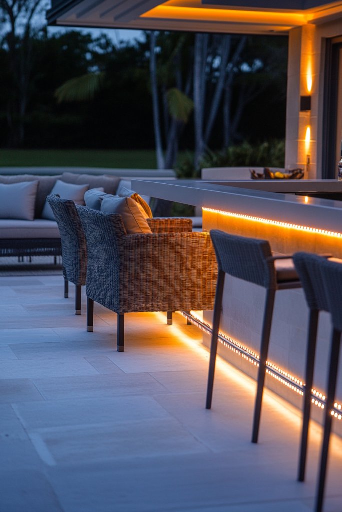 Imagine a strip of cool white or colored LED lights glowing softly beneath your outdoor bar or seating area. The light spills downward, illuminating the underside without overwhelming the space. The sleek, continuous line of light adds a futuristic, clean aesthetic that’s both functional and decorative. During evening gatherings, it provides just enough illumination for drinks and conversation, setting a sophisticated tone.