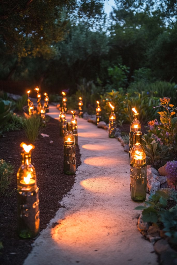 Use bottles of different sizes, shapes, and colors for a lively visual. Decorate with painted or etched designs for extra personality. During colder months, switch to LED or solar-powered options to avoid maintenance issues. Line them along pathways, around flower beds, or in terraced garden steps. Combine with string lights or lanterns for layered lighting. The versatility allows you to match your decor or mood.