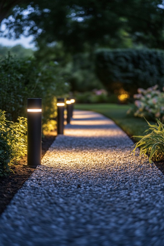 Picture sleek, modern stake lights with soft LED glows lining your garden paths and walkways. They cast gentle pools of light that highlight the textured stone or gravel beneath. As night falls, the pathway becomes a glowing ribbon, guiding visitors effortlessly through your yard. The subtle light creates a sense of depth and dimension, making your landscape look polished and inviting. It’s a simple upgrade with a big visual impact.