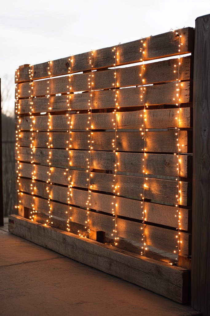 Visualize a large wooden frame constructed from weathered pallet planks, standing as a backdrop or centerpiece in your yard. Inside, twinkle fairy lights are woven and draped, creating a luminous, textured display. The rough wood contrasts beautifully with the delicate glow of the lights, adding warmth and personality. During evening hours, it becomes a captivating focal point, inviting friends and family to gather around.