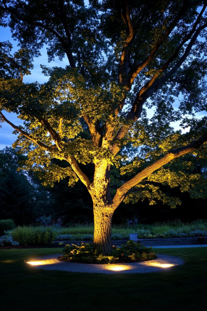 Imagine a focused beam of light at the base of a grand tree, illuminating the trunk and spreading upward into the canopy. The leaves shimmer in the glow, revealing textures and colors you didn’t notice during the day. Shadows dance across the bark, creating a dynamic, living sculpture. The overall effect transforms your yard into a mysterious, enchanting space filled with depth and dimension.
