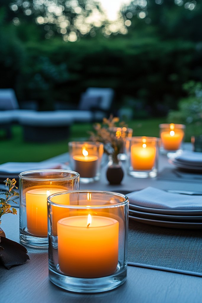Select flameless candles with realistic flicker effects and long-lasting batteries. Arrange them on your outdoor table, mixing heights and styles for visual interest. Use timers or remote controls for easy operation. Place them in weatherproof holders or lanterns to prevent wind from disturbing their placement. Consider battery life and replace or recharge batteries as needed. For safety, avoid placing candles near flammable materials or in high-traffic areas.