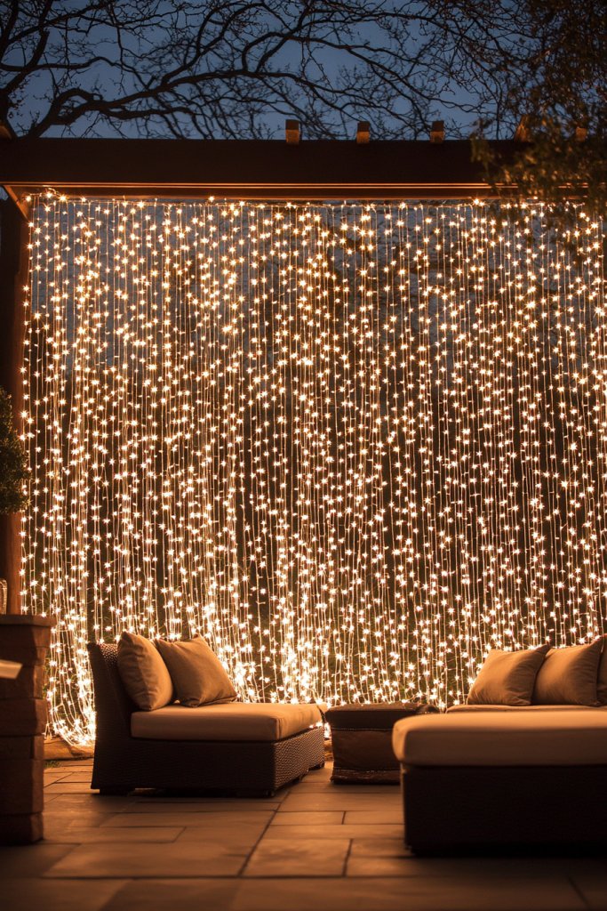 Imagine a wall or fence draped with rows of delicate fairy lights, shimmering and twinkling in unison. The curtain effect creates a glowing backdrop that instantly elevates the space. When lit at night, the tiny bulbs cast a starry glow, making your outdoor area feel magical and alive. You can add hanging lanterns or lightweight fabric for extra texture, but even the simplest setup screams celebration. It’s like having your own celestial sky right in your backyard.