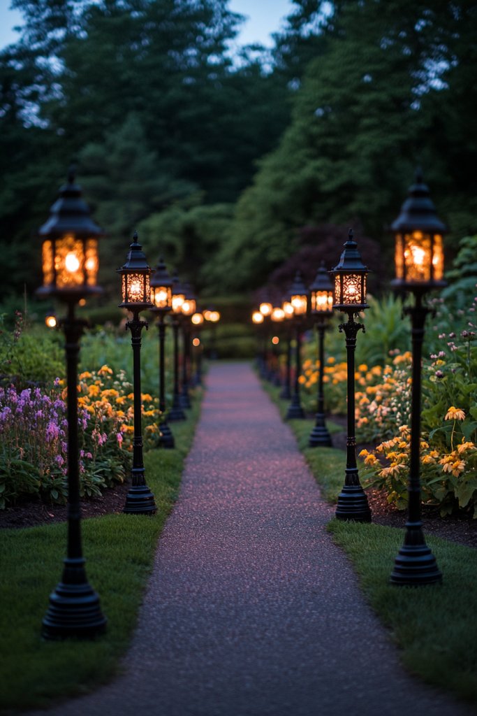 8. Lantern Stakes Along Garden Beds for Visual Guidance