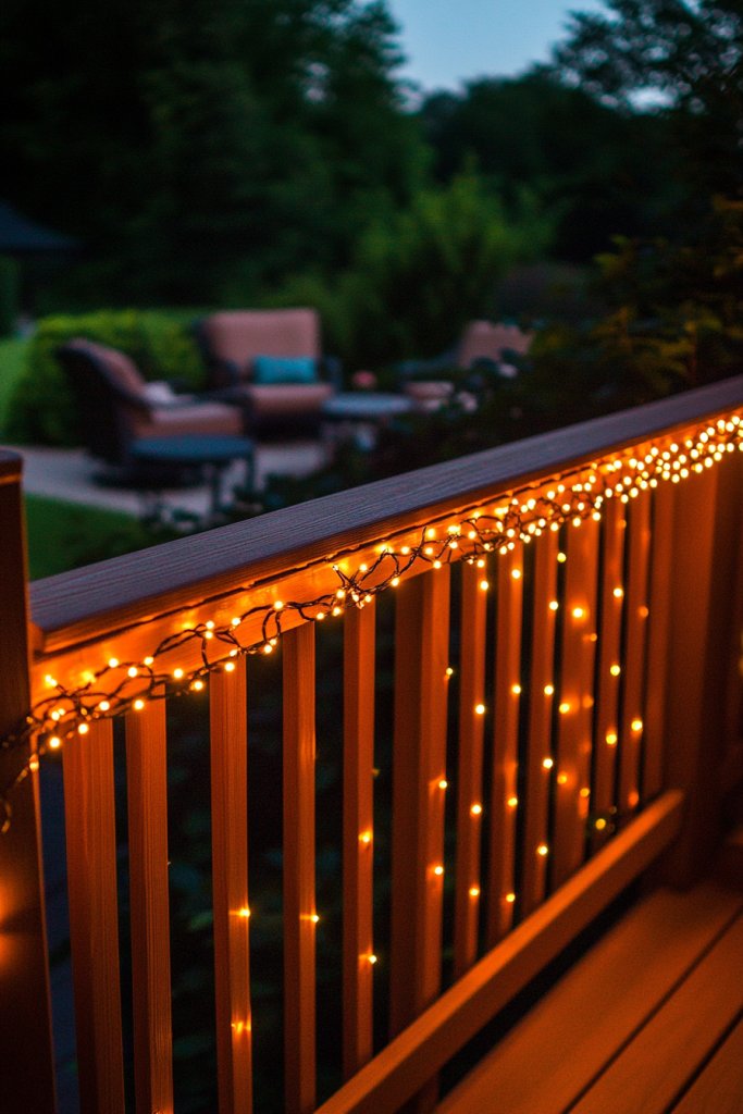 Add decorative elements like fabric ribbons or tiny ornaments along the strings for extra flair. Use dimmer switches or remote controls to adjust the glow intensity. Pair with outdoor lanterns or candles for layered lighting. Incorporate seasonal decor—like wreaths or garlands—around the railing for a festive feel. Personal touches turn your deck into a personalized outdoor oasis.