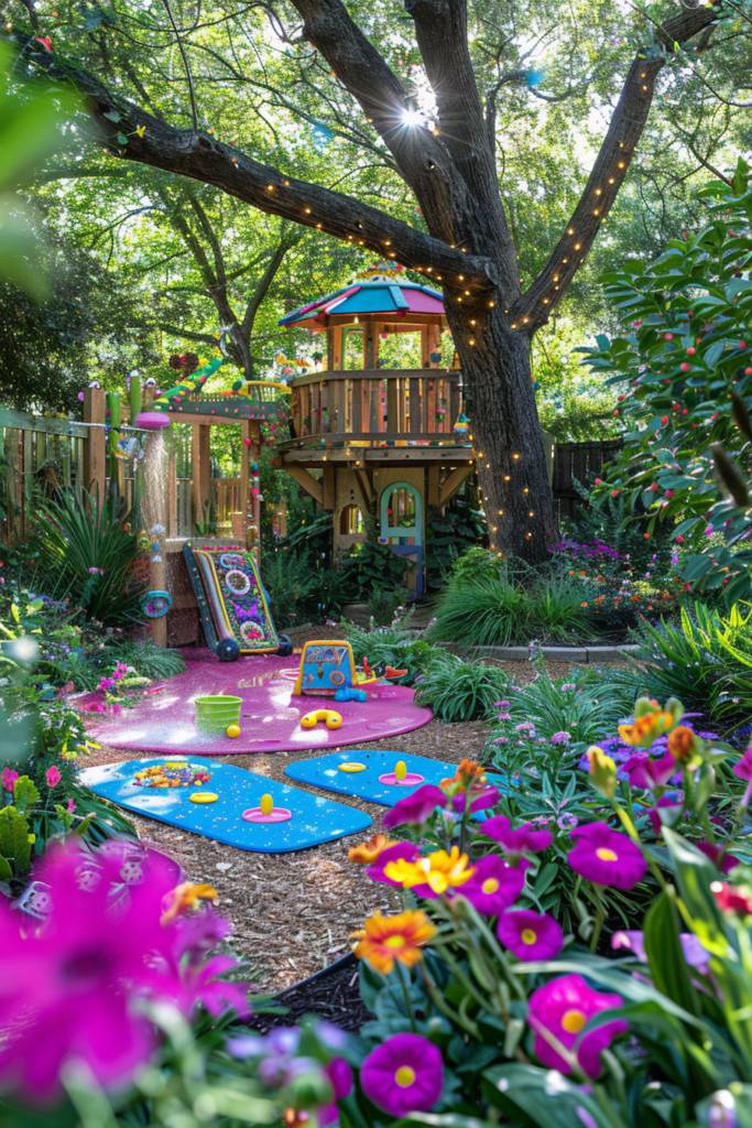 Incorporate whimsical elements like a tire swing or climbing ropes for added excitement. Don’t forget to include a shaded area, perhaps with a vibrant umbrella or a small tent, where kids can retreat for a snack or storytime.