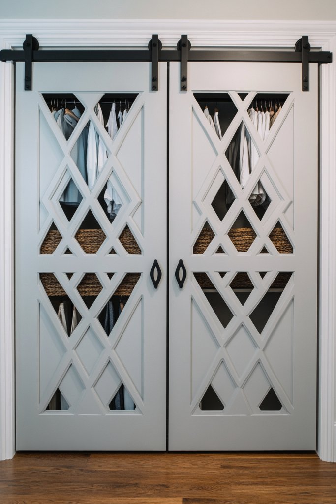 Looking for a way to add visual interest and a hint of privacy to your closet doors? Double cut-out barn doors with geometric openings serve both purposes beautifully. They create a striking focal point while allowing glimpses of the interior. Who says functional design can’t be artistic?
