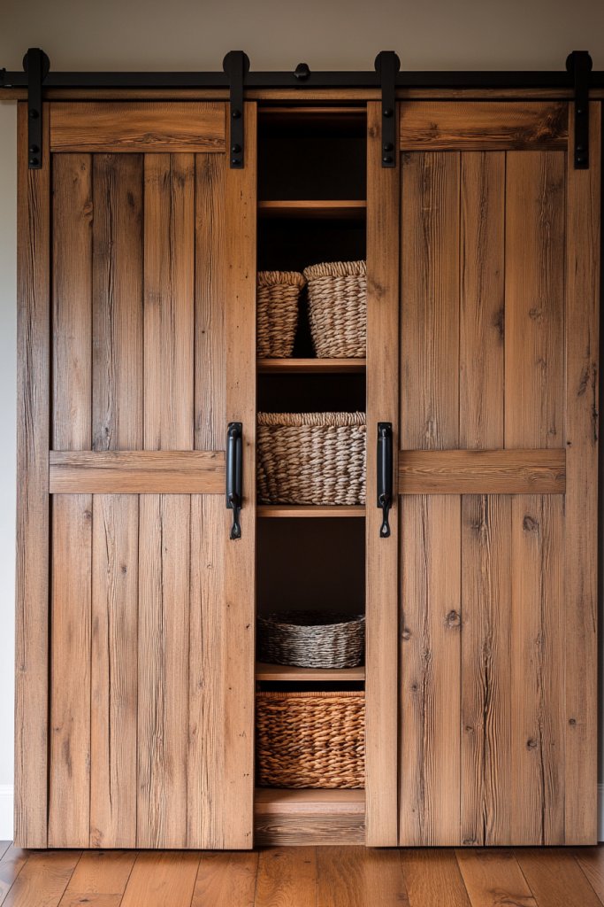 You can customize reclaimed wood for a more refined or rugged look, depending on your style. For farmhouse chic, pair it with black iron hardware. If your decor leans toward coastal, choose lighter, driftwood-inspired finishes. In small spaces, a single panel can make a big impact, while larger closets might benefit from double doors. Seasonal accents, like cozy throws or woven baskets, complement this rustic aesthetic.