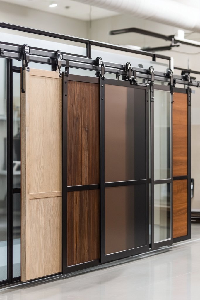 Picture a set of panels that can be combined in various configurations—single, double, or multiple doors—depending on your needs. Materials range from wood to metal, with options for decorative panels or plain finishes. These systems slide smoothly on tracks, creating a sleek, modular look. When closed, they form a cohesive, unified surface.